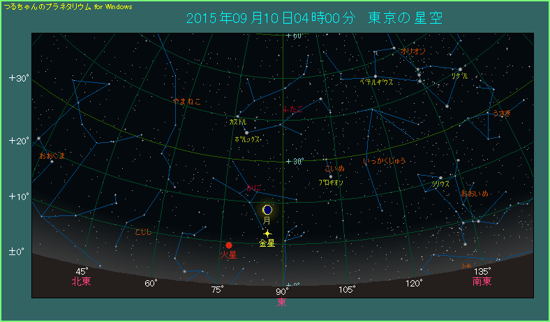 下の星図は日の出から1時間19分前、東京から見た東の空のようすです。金星は12.5度の高さにあり、その真上方向に月齢26.2の細い月があります。月は左下側が光っており、地球照が美しいでしょう。
