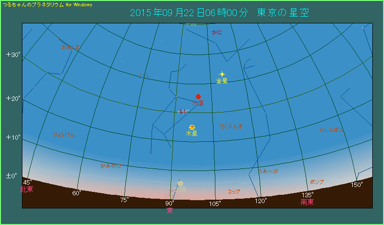 金星を1等星に例えるなら、普通の1等星は5.5等の明るさにしかなりませんから、驚くべき明るさです。しかも意外なことに、9月22日の金星と太陽との離角は40度に達しています。条件さえ整えば金星は昼間でも肉眼で見ることができますから、最も明るくなるこの時期に挑戦してみられてはいかがでしょうか。