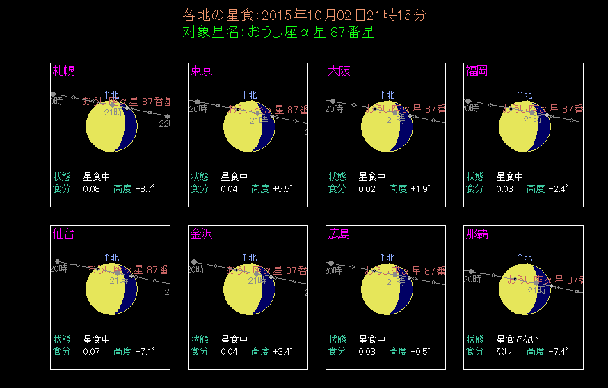 また、地域によっては潜入も見られます。南側の限界線が仙台のやや南側を北西から南東に横切っており、これよりも北側のエリアでは潜入を見ることができます。ただ、条件の良い札幌でも潜入時刻における月の高度は4度しかありませんから、条件は良くありません。