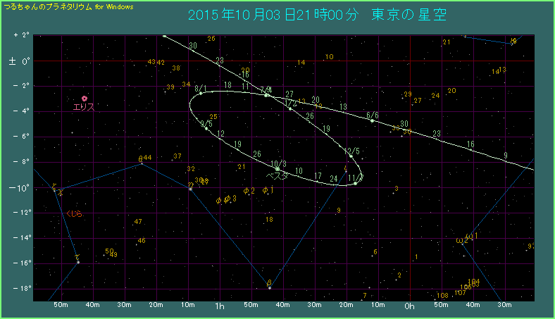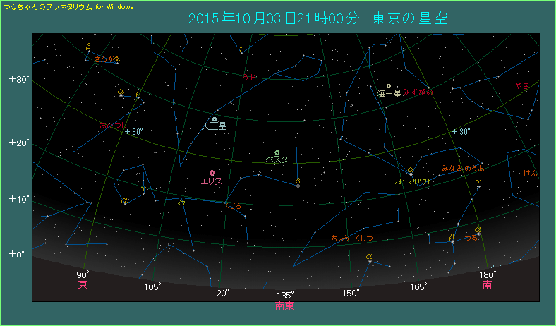 ベスタが見える場所はくじら座で、β星のデネブ・カイトス(2.1等)からたどるのがわかりやすいでしょう。といっても、この頃のベスタは6.2等の明るさしかありません。肉眼で見るのはまず無理ですから、双眼鏡を使って存在を確認しましょう。