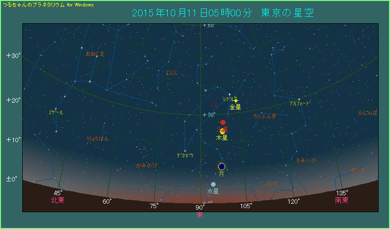 下の星図は朝5時ごろのようすです。日の出から43分前ということで、東の空はだいぶ明るくなってきています。