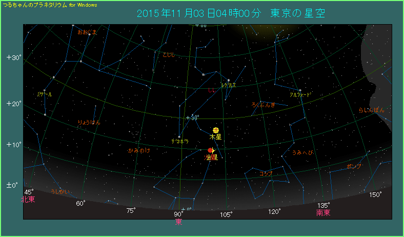 下の星図は11月3日4時の場合です。東の方角を見ると、-4.3等と非常に明るい金星のすぐ左に、赤く光る1.7等の火星があります。11月4日の場合では、金星から見た火星は左上へ移動しますが、間隔は3日とほとんど同じです。上方には木星も見えて、とてもにぎやかで楽しいでしょう。