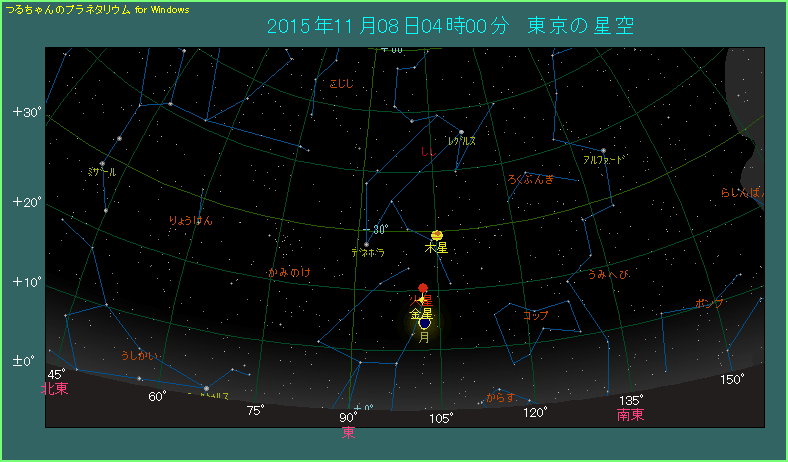 下の星図は11月8日の朝4時ごろ、東京から東の方角を眺めた空のようすです。火星と金星は3日から4日にかけて、0.7度まで大接近したのが記憶に新しいところです。現在も間隔は2.2度と、まだまだ大接近の名残が続いています。今日はここへ月が近づきます。