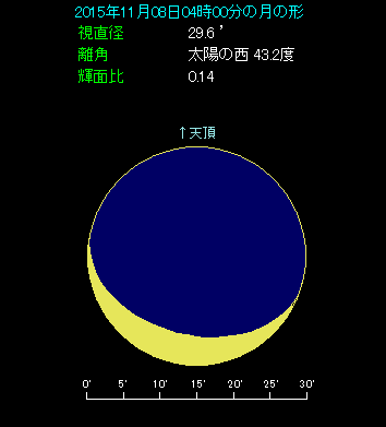 月齢は昨日よりも一つ上がって25.8と、さらに細くなりました。位置も木星のそばから大きく移動し、火星と金星の下側へやってきました。金星との間隔は3.8度で、まずまずの近さです。3つの天体が縦に並ぶ様子は、フィナーレを飾るにふさわしいものです。火星よりも上方にある木星もいっしょにご覧になり、接近パレードの最後を楽しみましょう。
