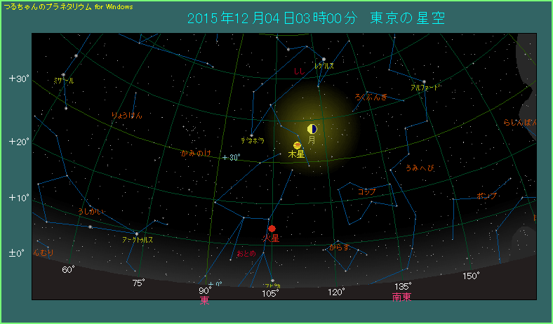 12月4日の早朝、月と木星が近づきます。星図のように3時ごろですと、両天体の間隔は5.3度と少し広い目です。最も近づくのは15時台で、2.4度まで近づくのですが、ここから半日ずれていますから間隔が広いのも仕方ありません。この後、月と木星は夜明けにかけて近づいていきます。2時間たった5時では4.7度と、少し縮まっています。