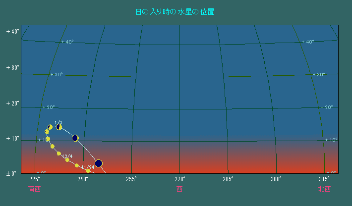 日の入り時刻における水星の位置変化(5日間隔)