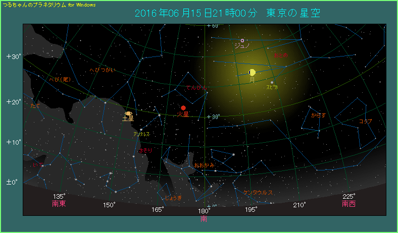 21時に火星は南東から南の空に見えます。明るさは-2.0等まで明るくなりました。半月前と比べると、さそり座のアンタレスから少し遠ざかったことがわかります。