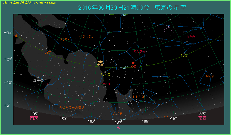 6月末になると、21時に火星は真南よりも西側に見えるようになります。明るさは-1.4等まで落ちました。最接近の頃は0.50AUだった距離が0.57AUと少しずつ遠ざかってきている上に、太陽光が斜めから当たるようになって、火星が光らない陰の部分ができてきたのでしかたがありません。