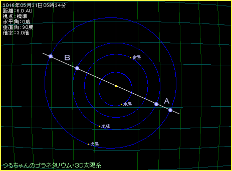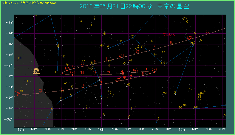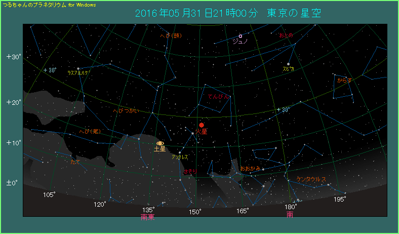 東京で5月31日22時ごろ 南東から南の空に見える火星 |