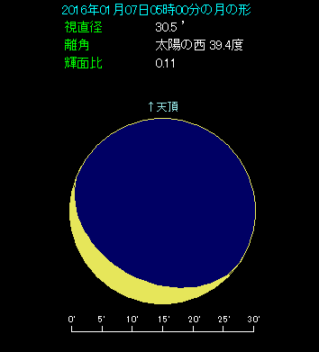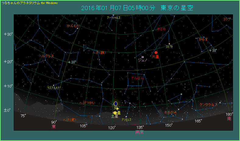 1月7日の早朝、月が金星に接近します。下の星図は1月7日の朝5時ごろ、南東の空のようすです。月齢は26.4と細い月で、左下側が光っています。金星は月から見て右下にあります。-4.0等と非常に明るいですから、すぐにそれとわかります。両天体の間隔は3.0度ですから、いい感じの接近です。