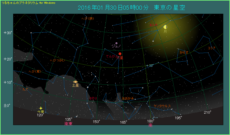 そんな中、1月30日に火星が西矩となります。西矩とは、惑星が太陽から西側へ90度離れることです。下に示した太陽系の図を見ると、太陽−地球−火星が作る角度が90度になっていますね。こうなると、太陽系で火星よりも内側の軌道を回る地球が、外側を回る火星に次第に追いついてきます。それとともに両惑星の距離はドンドン縮まるでしょう。このようなことから、西矩は観測条件がこれから良くなってくるサインになります。