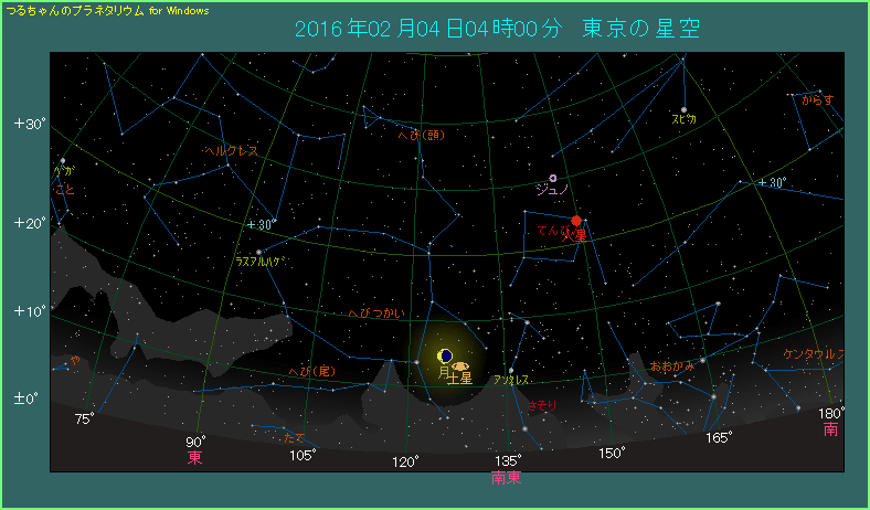 2月4日の夜明け前、月と土星が接近します。下の星図は2月4日の4時ごろ、南東の方角を眺めたものです。月と土星が2.9度の間隔で接近しています。最も接近するのは東京の場合で3時55分ですから、星図は最接近した状態だと思ってよいでしょう。