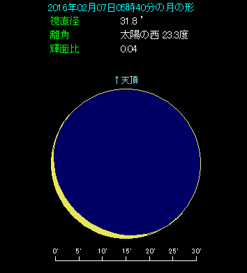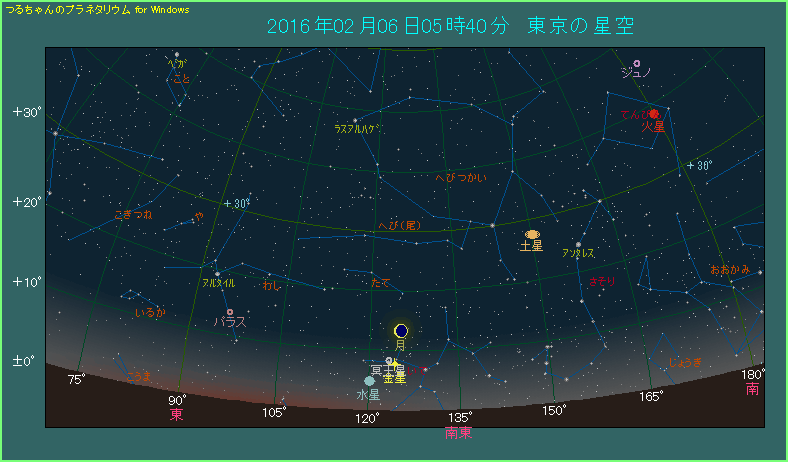 まず2月6日です。この日は月が金星の上方へやってきます。東京の日の出は6時38分ですから、星図のように5時40分ごろは日の出から1時間前ということになります。