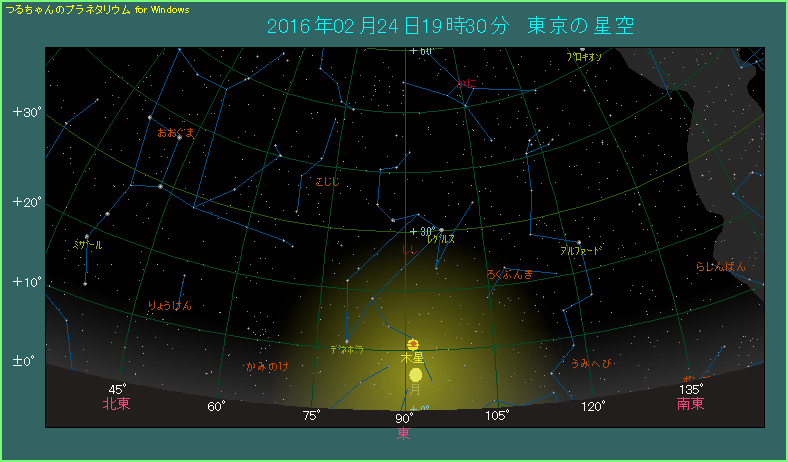 月と木星のペアは先月の元旦に接近した後、28日にも近づいて一ヶ月の間に2度の接近がありました。そして2月は24日に再び近づいて両者が並びます。 下の星図は2月24日の19時半ごろ、東空のようすです。月齢は15.8で前日が満月です。大きな月の真上へ5.0度離れたところに木星があり、縦に並んでいます。なお、24日の朝5時の場合だと間隔は4.7度で、もう少しだけ近づいているのですが、多くの方が見やすい夕方の時間帯を紹介しました。