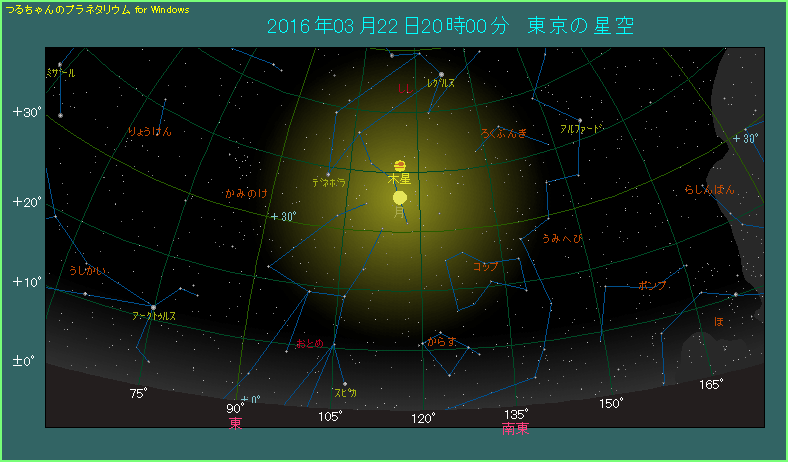 3月22日は月と木星が近づきます。東京で最も近づくのはお昼前ごろですから、実際に観測することはできません。下に示した星図では、最接近から8時間半が経過した20時としました。 東南東の空に月齢13.4という満月直前の月があります。木星は月の上方へ5.3度離れたところに見えます。少し間隔が開いていますから、見ごたえという面ではやや物足りないかもしれません。木星は3月9日に衝を迎えたばかりですから、天体望遠鏡をお持ちの方は、ついでに木星へ向けてみるとよいでしょう。
