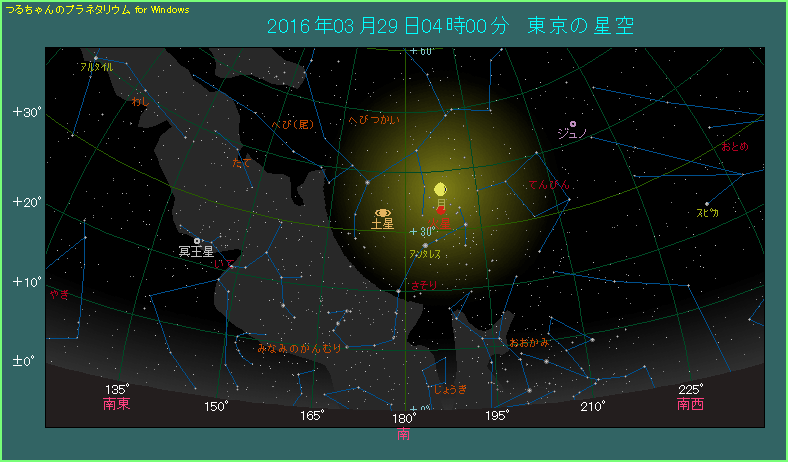 ところで、火星から左下方向へ 6.4度離れた位置には、火星と赤さを競うことで有名な、さそり座の赤い1等星アンタレスがあります。また、火星から左方向へ9.7度離れたところには、落ち着いた黄土色をした0.3等の土星もあります。これら4天体をまとめて楽しむのがよいでしょう。