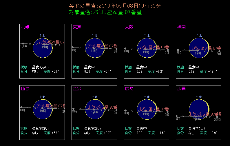 各地のアルデバラン食のようす |