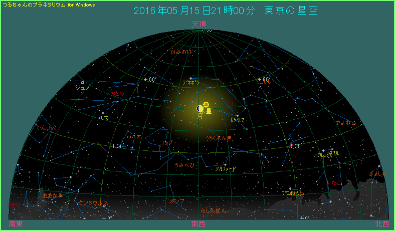 5月15日の夜に月と木星が接近します。最も接近するのは 15時台の後半で、2.2度まで近づきます。星図にある21時ですと、最接近から5時間が経過しており、間隔は3.0度まで広がっています。月齢は8.7で半月よりも少しだけ太っています。木星は月から見て右上にあります。 このペアの接近としては、2016年に入ってから最も条件が良いものですから見逃さないようにしてください。