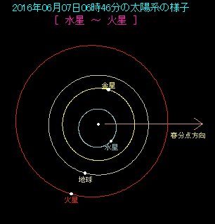 6月7日は金星が外合になります。外合とは惑星が太陽よりも遠い位置にありかつ、惑星が太陽と同じ方向に見えることです。下の図を見ると、地球−太陽−金星がこの順に一直線に並んでおり、金星が外合であることがわかります。こうなると金星は太陽の光に邪魔されて、いかに金星が明るいといえども、観測することができません。