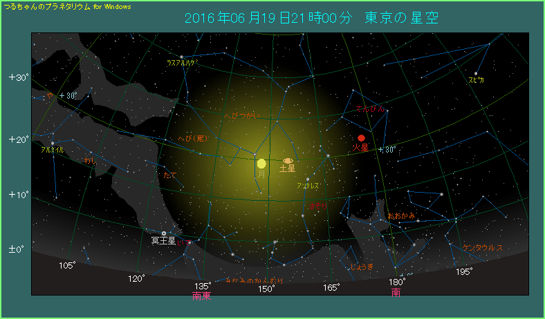 6月19日の夜は月と土星が近づきます。といっても今回は条件があまりよくありません。下の星図は21時ごろに南東方向を眺めたものです。月齢は14.4という翌日が満月の大きな月です。その右方向に土星があります。両天体の間隔は6.6度ありますから、だいぶ開いています。 土星の右下へ6.3度離れた位置に赤い1等星アンタレスがありますし、土星から大きく右へ離れたところに火星もあります。これらもいっしょに楽しんでください。