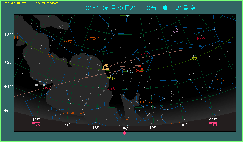 火星は4月17日に留となって以降、東から西へ動く逆行を続けてきました。その後、5月31日には地球最接近となって、話題になりました。そんな火星は6月30日に再び留となり、動く向きが変わって順行に戻ります。下の星図をご覧になると、その意味がおわかりいただけると思います。