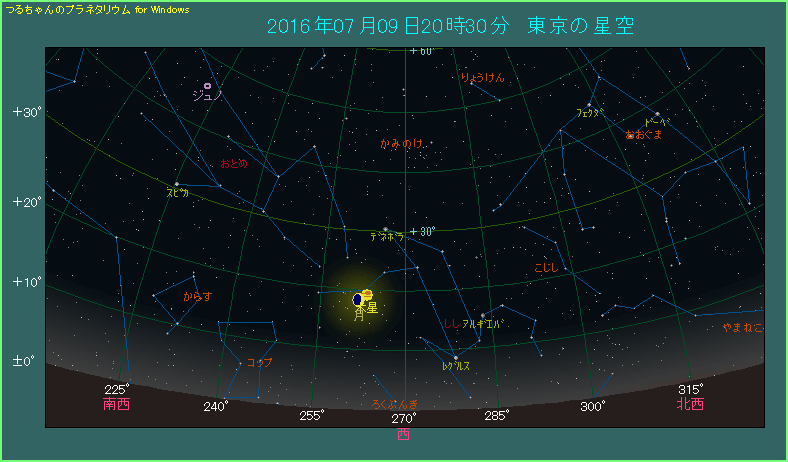 7月9日は月と木星が接近します。東京で最も近づくのは19時過ぎごろです。下の星図のように20時半ごろは、最も接近した状態に近いものです。月齢