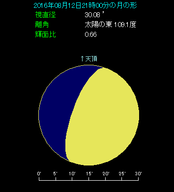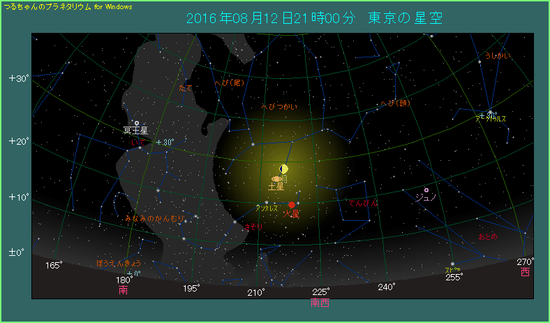 ペルセウス座流星群が極大となる夜、8月12日に月と土星が接近します。東京で最も近づくのは22時21分です。下の星図のように21時ごろは最接近に近い時間帯で、両天体の間隔は3.0度となっています。月齢は9.6と半月を過ぎ、月は丸みを帯びた形をしています。0.4等の土星は月の左下にあります。