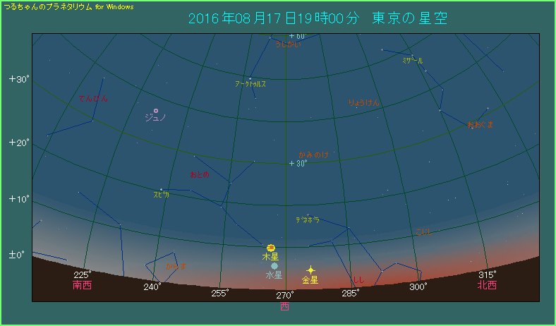 下の星図は、東京で日の入りから32分たった19時ごろに、西の方角を眺めたようすです。0.4等の水星は高度が5.7度しかなく、薄明が強く残る状態で探すのは少々つらそうです。右寄りに見える金星や、上方に見える木星を頼りに、双眼鏡を使って探してください。