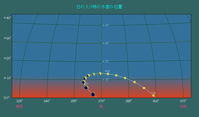 8月17日は水星が太陽の東側へ最も離れる東方最大離角となります。それでは太陽から大きく離れて見やすいかというと、残念ながらそうでもありません。水星は地平線を這うように移動しながら太陽から離れるため、高度があまり高くならないのです。