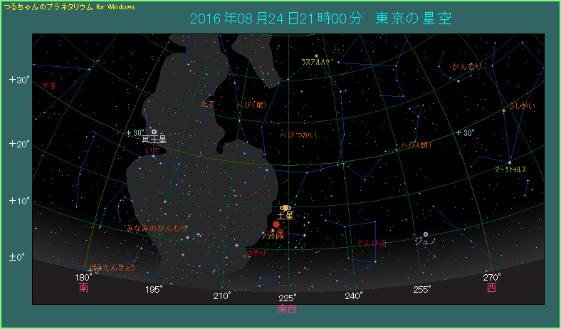 下の星図は8月24日の21時ごろ、南西の空を眺めたようすです。やや低い位置に、赤色をした明るい星が見つかり、これが火星です。火星の明るさは-0.4等で、地球最接近から3ヶ月弱がたった今でも、まだマイナス等級を維持しています。