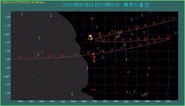 火星とアンタレス、および土星との接近は、24日だけではありません。翌日の25日も同程度の接近間隔を維持しています。もし24日に見損なった方は、ぜひ25日にご覧になってください。