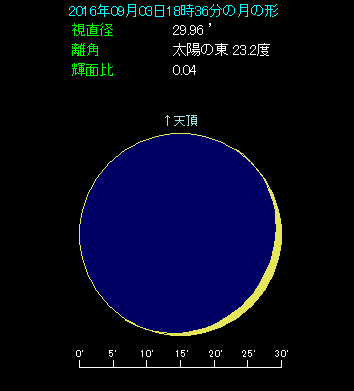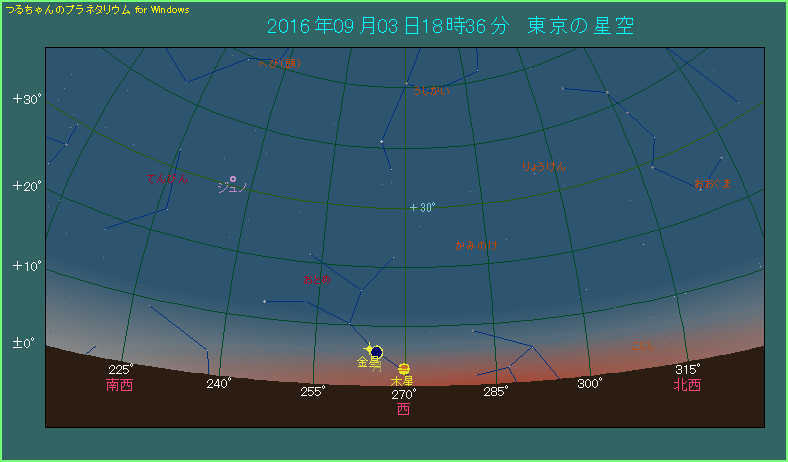 9月3日の日没後まもなく、月と金星が接近します。実際に両天体が最も接近するのは21時台ですが、太陽が沈んだ後にすぐ沈んでしまいますので、日没後まもなくという表現になっています。