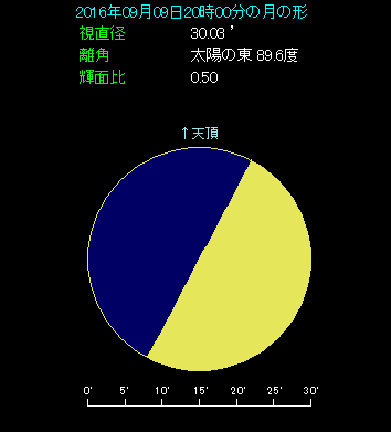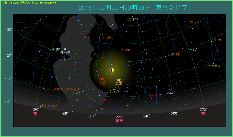 9月9日は月が火星と土星に近づきます。そしてこの日は、ちょうど上弦です。20時の時点で月の輝面比が0.5となっており、本当にちょうど半分光る半月です。