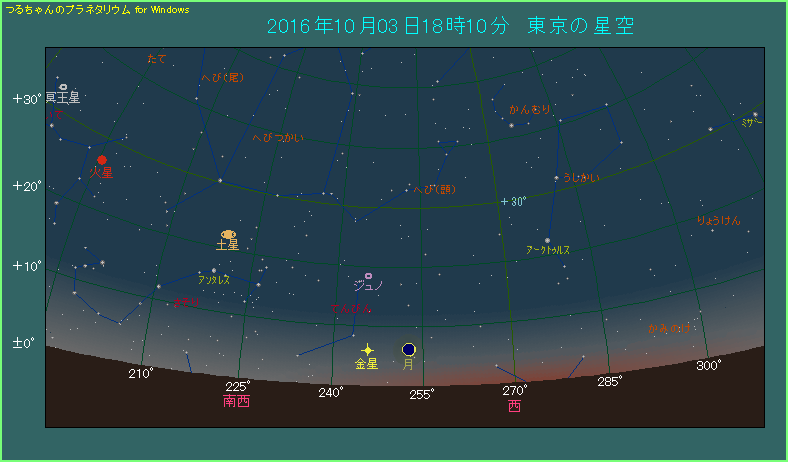 今回は10月3日と4日に、それぞれ月が金星に近づきます。まず、10月3日の場合です。下の星図のように、金星の右側に月があります。この日、東京での日の入りは17時22分ですから、日没から48分が経過しています。まだ薄明が残った状態で、空が完全に暗くなるには、あと37分が必要です。