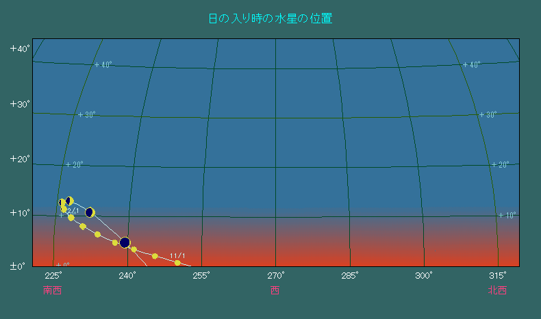 下の図は日の入り時刻において、水星が日々どこに見えるかを示したものです。この図を見ると水星は、日の入り時に南西方向に見えることがわかります。日の入り時の水星高度は12月11日の場合、東京で13度しかありません。最も条件が良い時には20度前後に達することを考えると、あまり条件が良いものではありません。