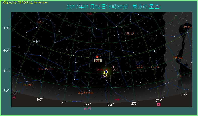 金星はとても明るいだけに、月と金星の接近は華やか。しかも間隔が1度台の好条件。ぜひ両天体の接近をご覧になって、ちょっといい気分で正月をお過ごしください。