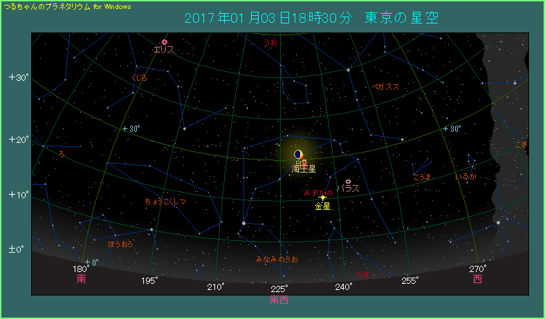 新年になってから3日目ですが、今日も天体の接近が見られます。1月3日に近づくのは月と火星です。 下の星図は18時半ごろに西の方角を見たようすです。月齢は昨日から一つ上がって5.1で、月がだいぶ太くなりました。火星はその右下へ0.8度離れたところにあり、大接近しています。 2017年は元旦から3日も連続で接近が観測できるという珍しい年です。この機に年初から接近観測に勤(いそ)しみましょう!
