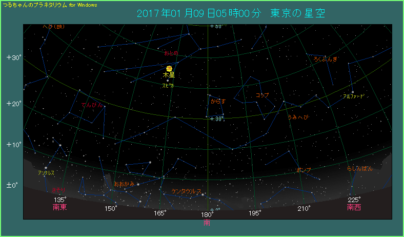 西矩の頃の惑星は日の出ごろに南中しますから、「そろそろ観測条件が良くなってくるよ」というサインになります。この後木星は 2月7日に留となり、順行から逆行に移ります。そして、4月8日に衝を迎えて観測条件が最良となります。これからの木星に期待しましょう。