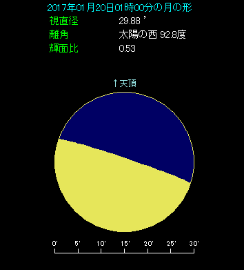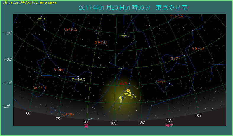 1月19日から20日に日付が変わった深夜、月と木星が近づきます。 今回は最接近する時刻が19日の16時ごろということで、だいぶ間隔が開いています。月齢は21.4と下弦の月で、木星は右上方向へ5.7度離れたところにあります。さらに木星から右下へ3.7度離れて、おとめ座の1等星スピカがあります。3天体をまとめていっしょにご覧になってください。
