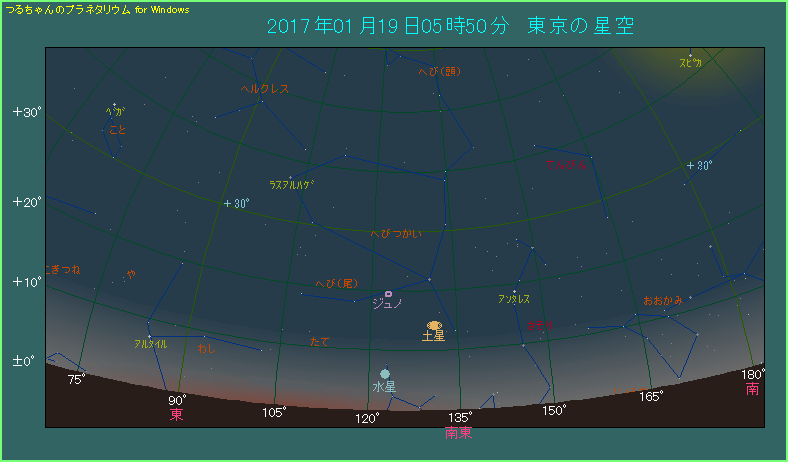 上の星図は日の出からおよそ1時間前、南東の空のようすです。水星が低空に見えます。明るさは-0.1等ですが、周囲が明るくなり始めており、少しわかりづらいでしょう。低空ということもありますので、双眼鏡を使って観測した方が確実です。1週間後には月が近づきますから、自信のない方は1月26日もねらってみてください。
