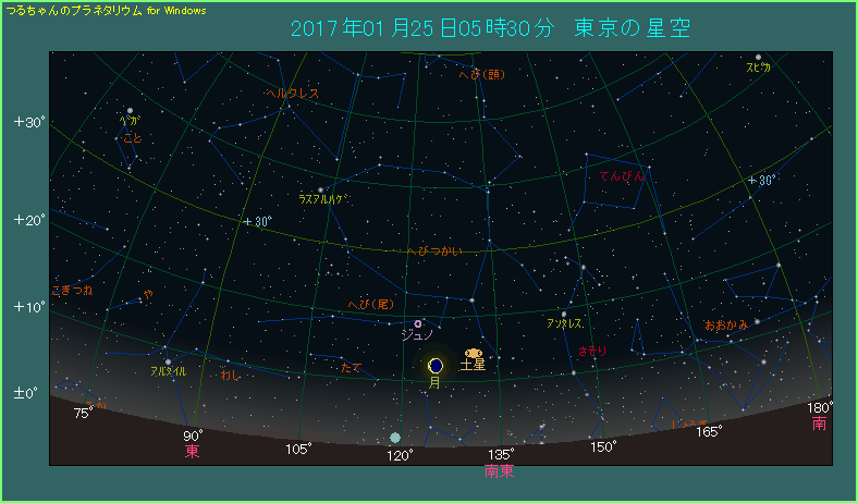 下の星図は1月25日の朝5時半ごろ、東京から南東方向を眺めたようすです。低い位置で月と土星が近づいています。間隔は6.1度と広い目ですし、すでに5時18分から空が明るくなり始めており、条件的にはあまり良くありません。