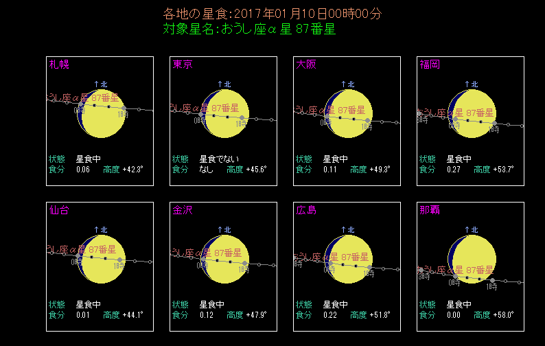 アルデバランといえば、おうし座の中にあるオレンジ色をした1等星ですね。昨年はアルデバランが月に隠されるアルデバラン食が起こりましたが、引き続き2017年も何度も起こります。このうち、全国で見ることができて高度が高く、条件の良いアルデバラン食が1月9日から10日にかけて見られます。