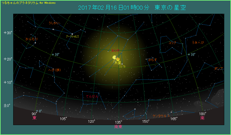 2月15日から2月16日にかけての深夜、月と木星が接近します。今回の接近距離は2.2度で、条件の良い接近です。月齢が18.7と月は太い目ですが、木星は明るいですから、月明かりに負けて見えなくなることはありません。 木星の右下へ3.7度離れて、おとめ座の1等星スピカも見えます。3天体が直線状に並びますから、まとめてご覧になってください。