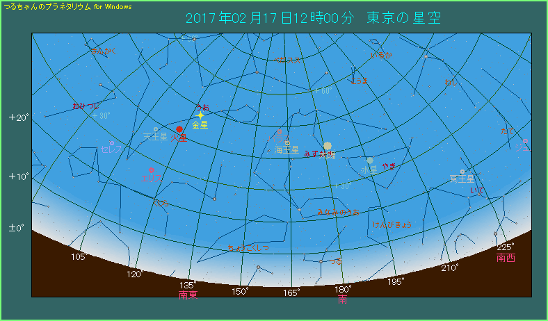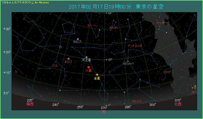年が明けてからの金星は高度が上がってきて、日没後の存在感が増してきました。そこへもって2月17日に最大光輝を迎え、金星の明るさはピークに達します。その明るさは-4.6等といいますから相当なものです。もし仮に金星を1等星の明るさにすると、普通の1等星は6.6等という哀れな姿になってしまいます。金星の輝きがいかに素晴らしいか、おわかりいただけると思います。