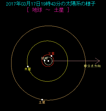 3月17日は土星が西矩となります。西矩とは、惑星が太陽から西側へ90度離れることです。太陽系の図を見ると、太陽−地球−土星が作る角度が90度になっています。土星は深夜に姿を見せるようになっており、日の出頃に南中します。これから土星の観測条件が良くなってきて、観望シーズンも間近です。
