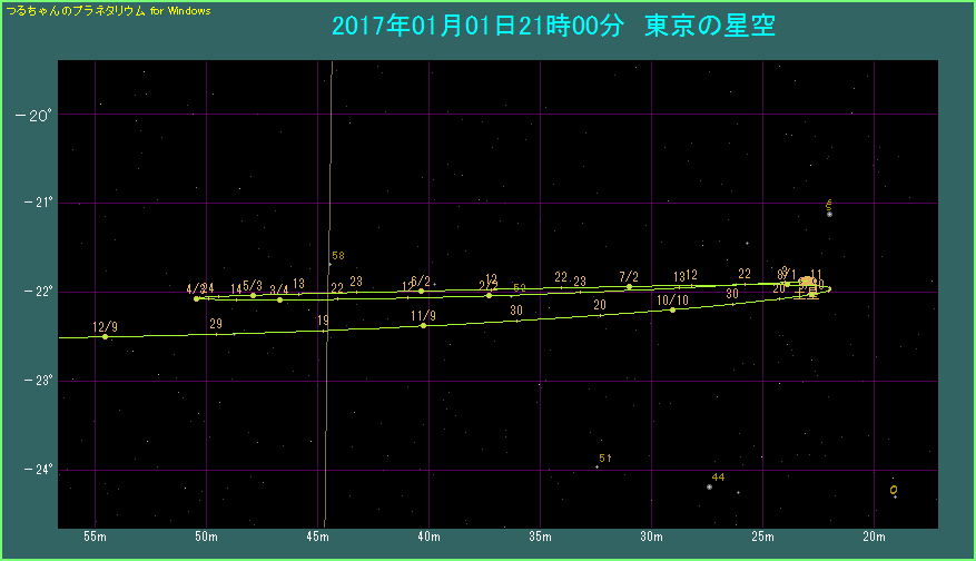上の星図は2017年における土星の経路を示したものです。日付が重なって少しわかりづらいですが、3月下旬から4月上旬に星図の左端近くで経路が反転しており、留となることがわかります。この後、土星は6月15日の衝を目指して地球に近づいてきます。といっても土星はもともと地球から遠いところにありますから、大きく近づくわけではありませんけれども。