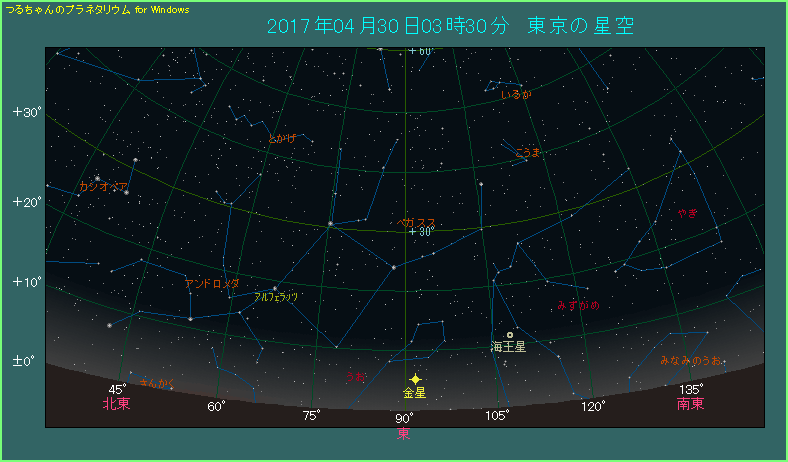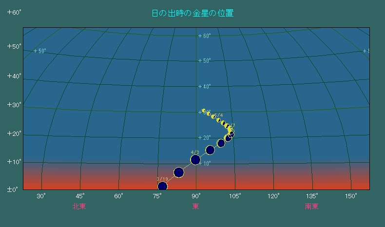 金星の明るさは-4.5等といいますから相当なものです。中にはUFOと間違える人もいるくらいの明るさですから、誰が見ても金星だと気づくでしょう。しかし、今回の金星は高度があまり高くありません。下の星図では金星が昇ってきたところで、高度は5度しかありません。しかも3時16分から空が明るくなり始めており、この後空がどんどんと明るくなっていきます。そんなわけで今回の最大光輝は、その輝きをゆっくり楽しむのが難しそうです。