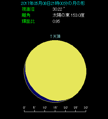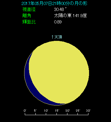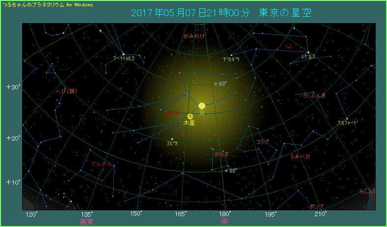 下の星図は5月7日の21時ごろに南の方角を見上げたようすです。月齢 11.0の大きな月の左下に、-2.4等と明るい木星が5.5度の間隔で並んでいます。最近の木星はスピカから近い位置にあったのですが、今月は9.9度まで開いてしまいました。