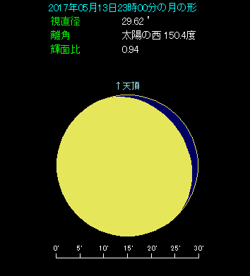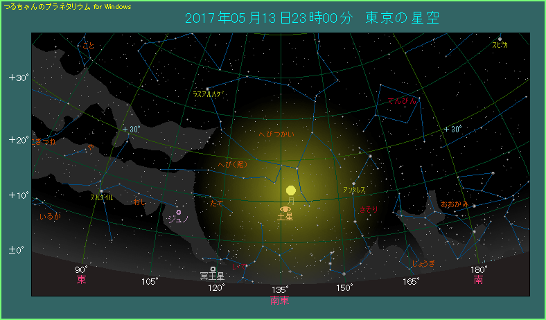 下の星図は5月13日の23時ごろに南東の方角を眺めたようすです。月齢 17.1という満月を過ぎた大きな月があります。土星はその下側へ4.7度離れたところにあります。
