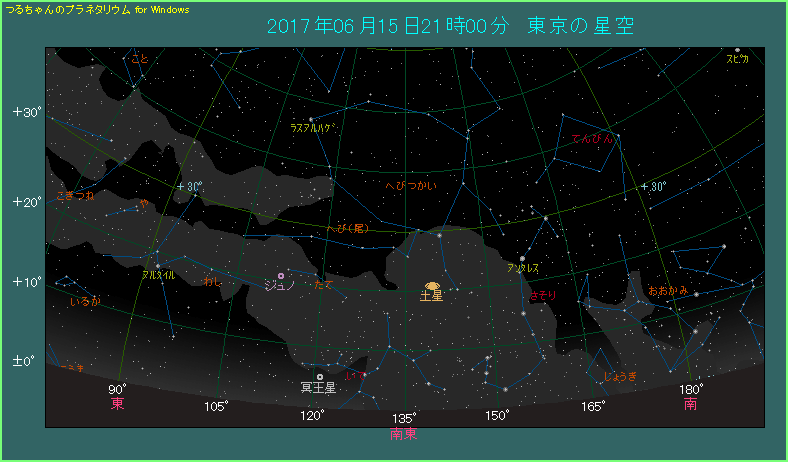 下の星図は21時ごろ、南東方向の夜空を眺めたようすです。あまり高くない位置に土星が見えます。土星は0等級と明るいですし、独特の落ち着いた黄土色をして目立ちます。近くにさそり座の1等星アンタレスがありますが、こちらは赤い色をしていますので、見間違えることはありません。